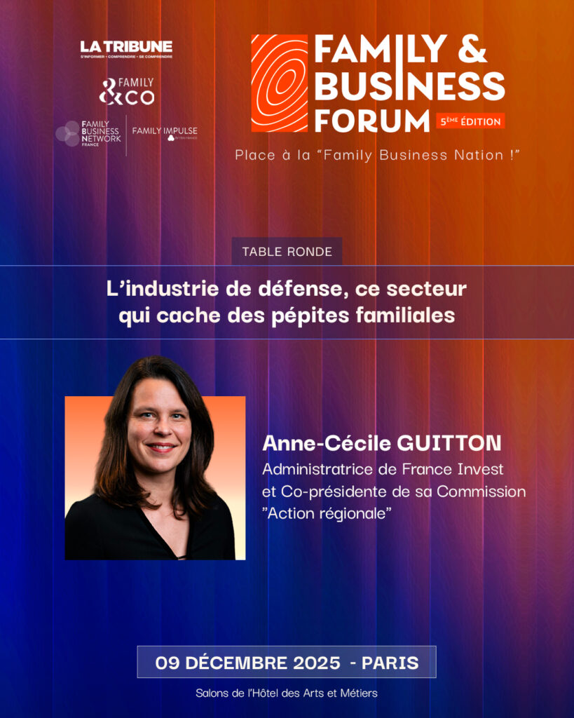 Anne Cécile Guitton, Administratrice de France Invest et Co-présidente de la Commission Action régionale, interviendra lors du Family Business Forum le 9 décembre prochain, sur le sujet : « L’industrie de défense, ce secteur qui cache des pépites familiales. » 🔗Plus d’infos